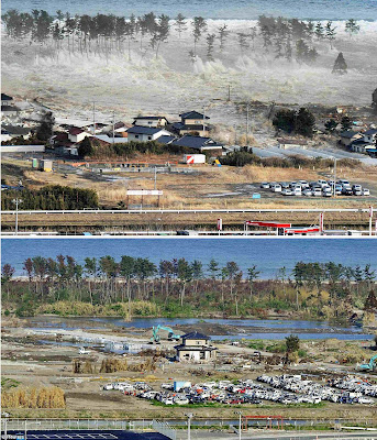 A parking lot of a shopping centre filled with houses and debris in Otsuchi town, Iwate prefecture two days after the earthquake hit and the same area picture on June 3