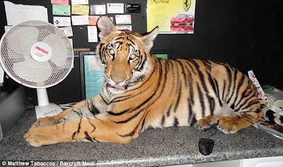 In fact, he's a 27-stone pet Bengal tiger who lives with Michael Jamison and his girlfriend Jackie Smit in Brakpan, South Africa.